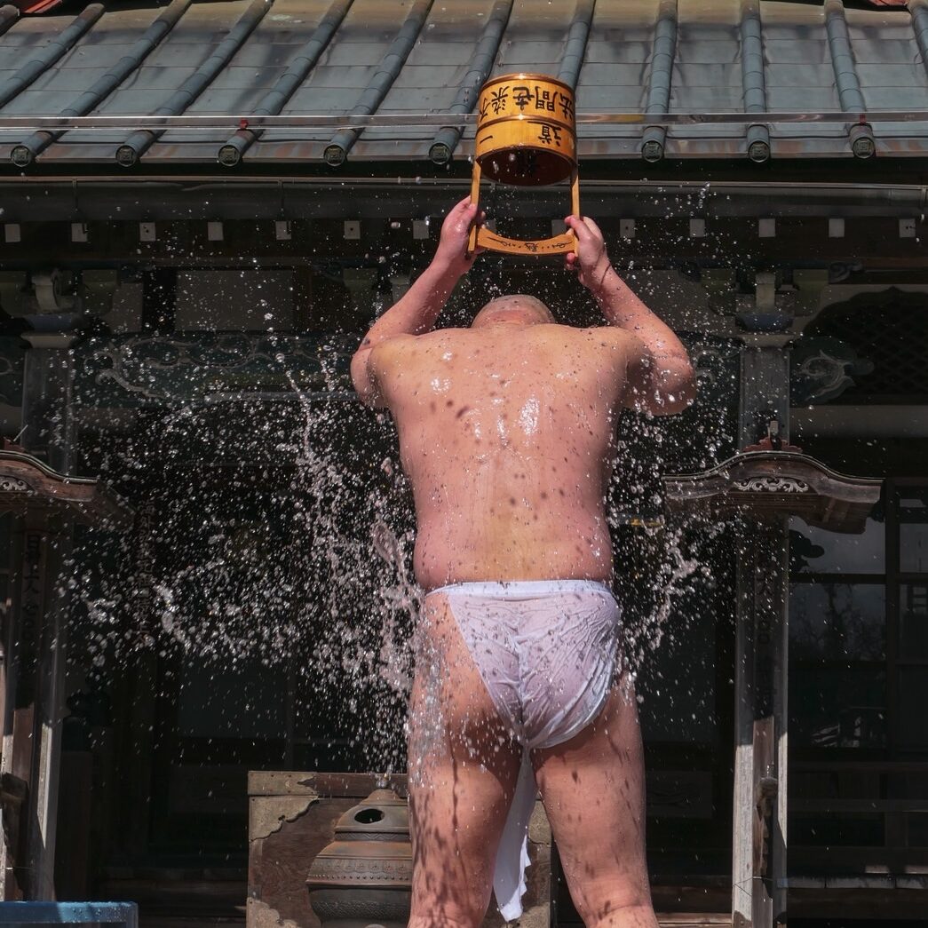 静寂の中、冷たい水を浴びて心身を清める伝統的な修行体験です。